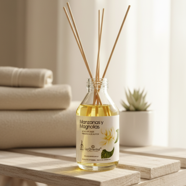 Déjate envolver por la frescura romántica de nuestra fragancia Manzanas & Magnolias. Este difusor combina la jugosidad crujiente de la manzana con la elegancia aterciopelada de las magnolias blancas. Es un aroma que transmite alegría, luz y una calidez delicada, ideal para transformar cualquier habitación en un espacio lleno de vida.