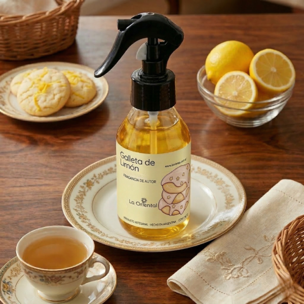 Nuestro spray de ambiente de Galleta de Limón es el equilibrio perfecto entre la frescura vibrante del limón y la suavidad reconfortante de la vainilla y la masa dulce. Una fragancia que abraza y despierta sonrisas apenas entra por la nariz.